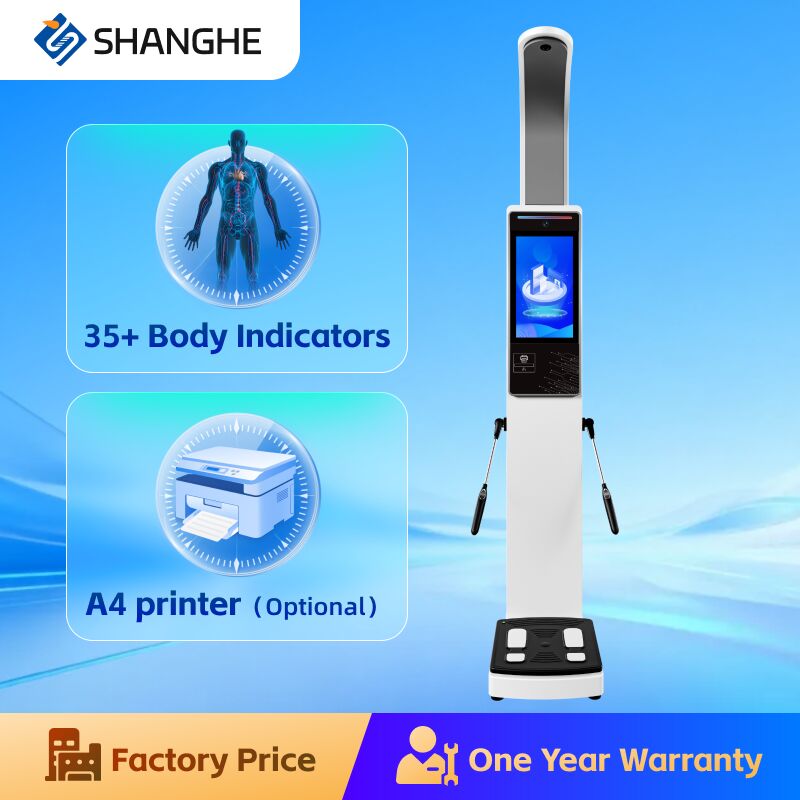 SH-V19F Анализатор здоровья всего телакомплексный анализ телаВключая ИМТ, процент жира в организме, мышечную массу и многое другое с использованием передовой 8-точечной электродной многочастотной технологии BIA.19-дюймовый сенсорный экран HD LCD, ультразвуковое измерение высоты, точный датчик веса и поддержка 17 языков.